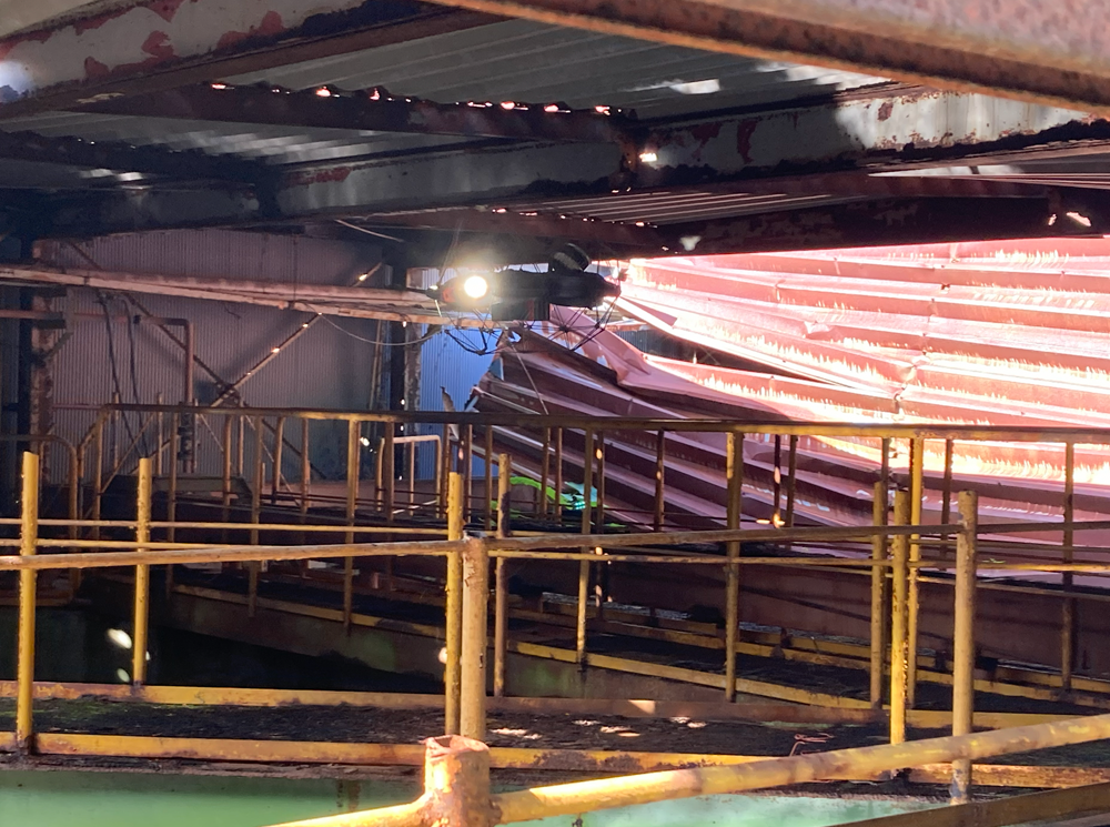 対象施設は老朽化が進行しており、点検用足場がすでに崩壊。作業員が内部に立ち入って目視点検を行うことは極めて危険な状態でした。安全性を確保しつつ、解体工事に必要な計画資料となる正確な情報を得る方法が求められていたのです。