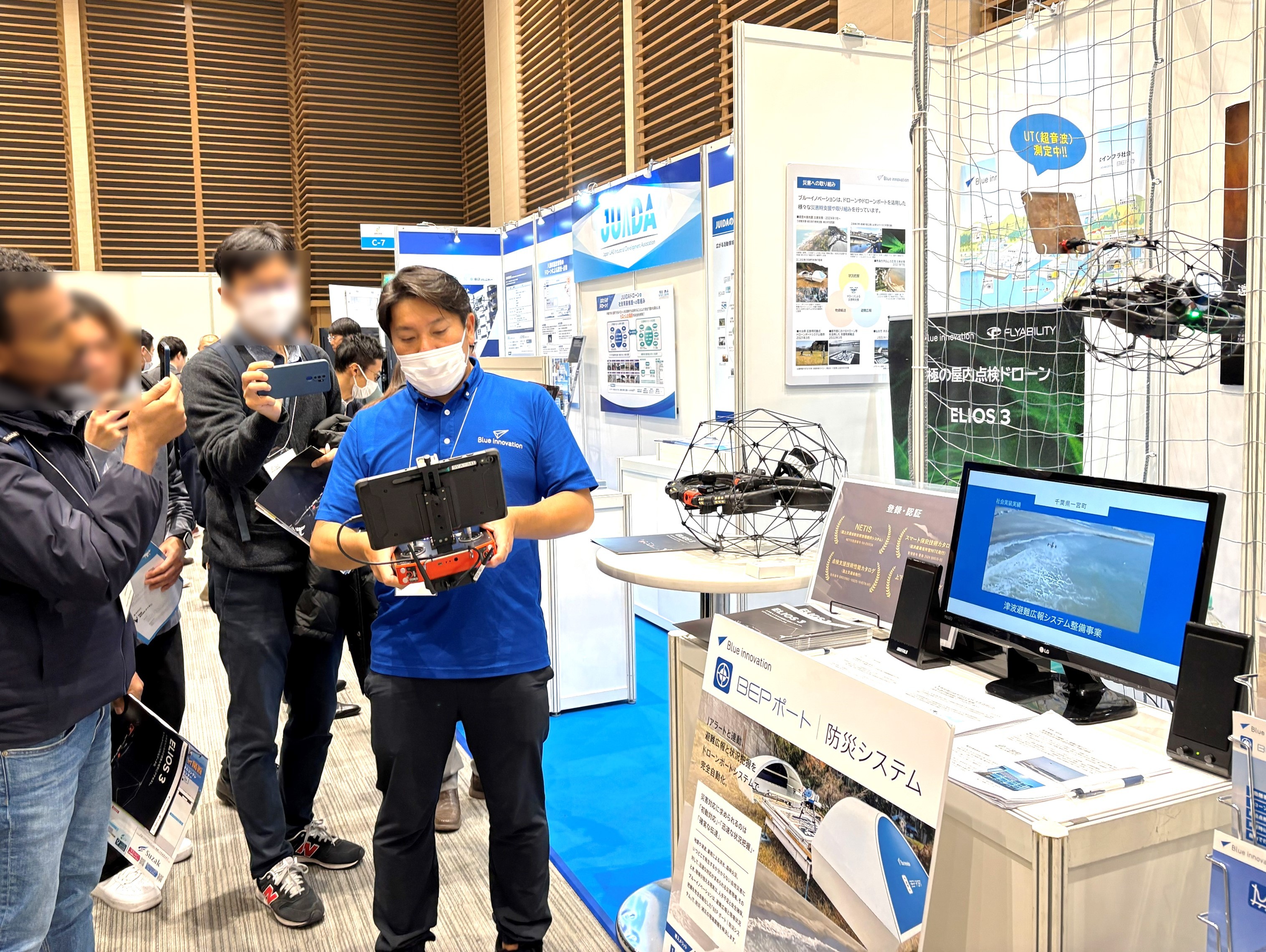 公共インフラやプラント設備など、屋内・閉所・暗所での点検ニーズに向けて、屋内点検用ドローン「ELIOS 3」を中心とした高度点検ソリューションを展示しました。会場でのデモフライトを通じて、GPSの届かない屋内空間での安定飛行、可視化・記録の精度、点検業務の省力化といった導入メリットを来場者の皆さまに体感いただきました。