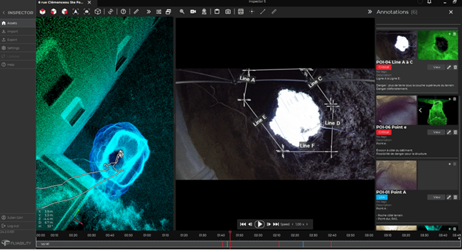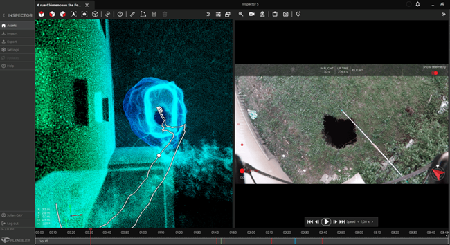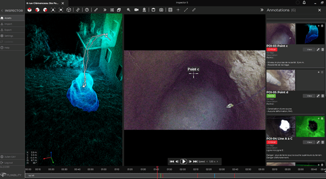 Julien氏は、Inspector 5を使用して迅速に報告書を作成、自治体に明確な結果を提供しました。LiDARスキャンによるデータは、穴の近くの建物に対するリスクのレベルを判断するために使用され、視覚的なデータは、測量士が洞窟内の状況(地質学的特徴か、ローマ時代の建造物の残骸か)を把握するための参考情報となりました。